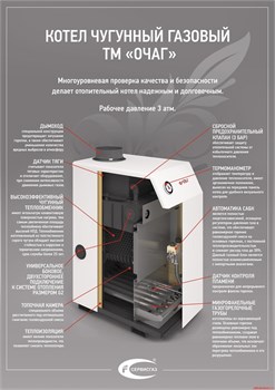 • Многоуровневая система безопасности (при отсутствие тяги, при погасание пламени), а также датчик перегрева теплоносителя.